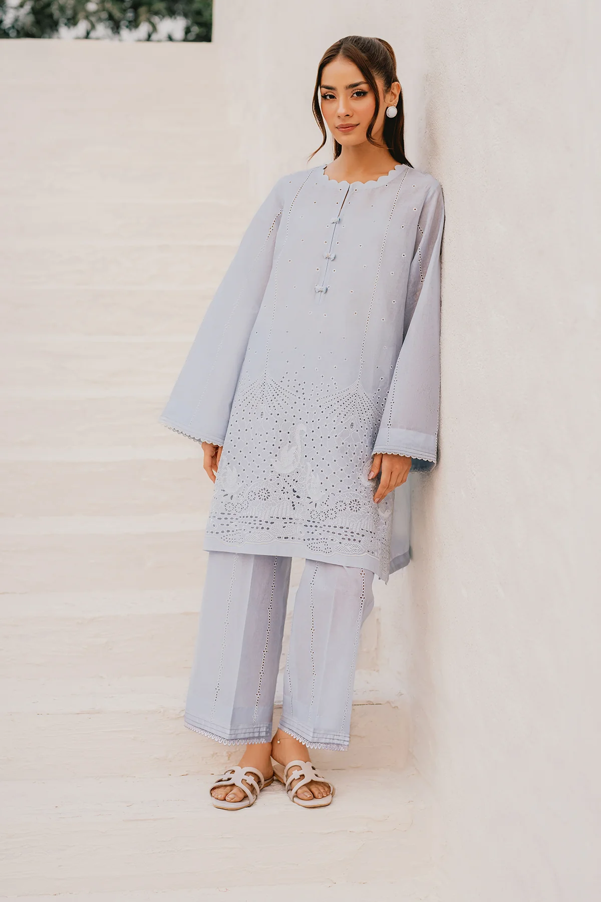 This stunning coord set is made from high-quality lawn fabric featuring intricate embroidered details, adding a touch of elegance to the overall design. The shirt features a solid base making it perfect for friends gathering.